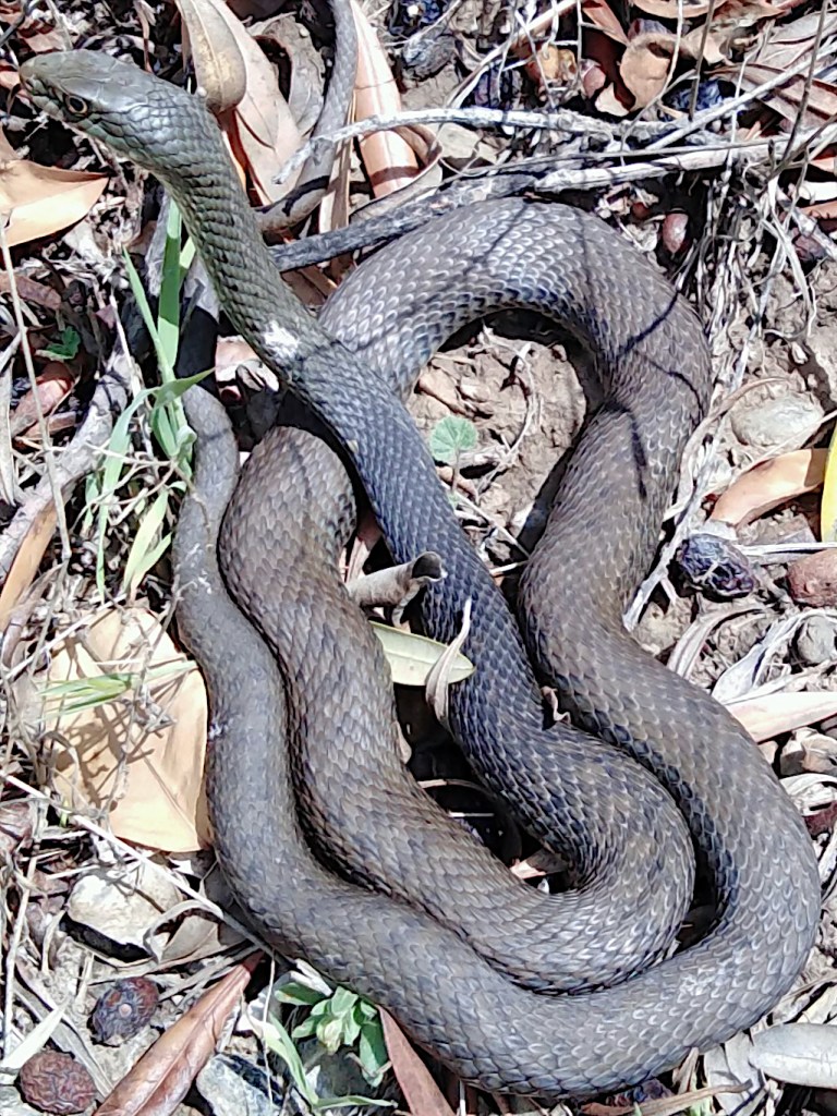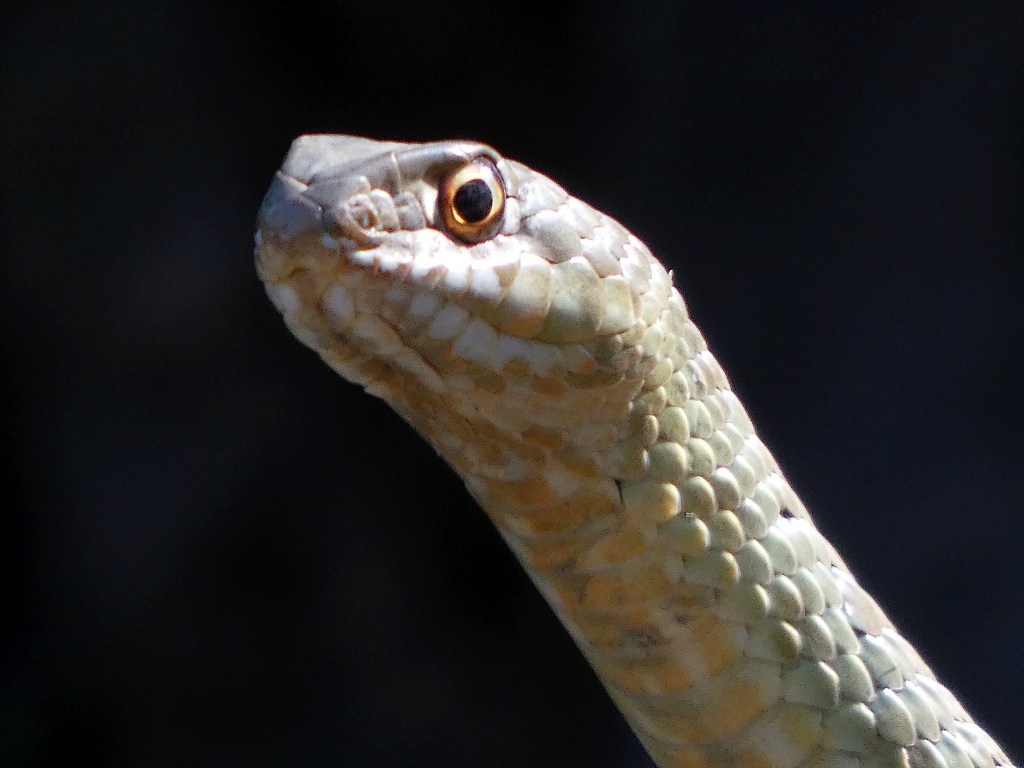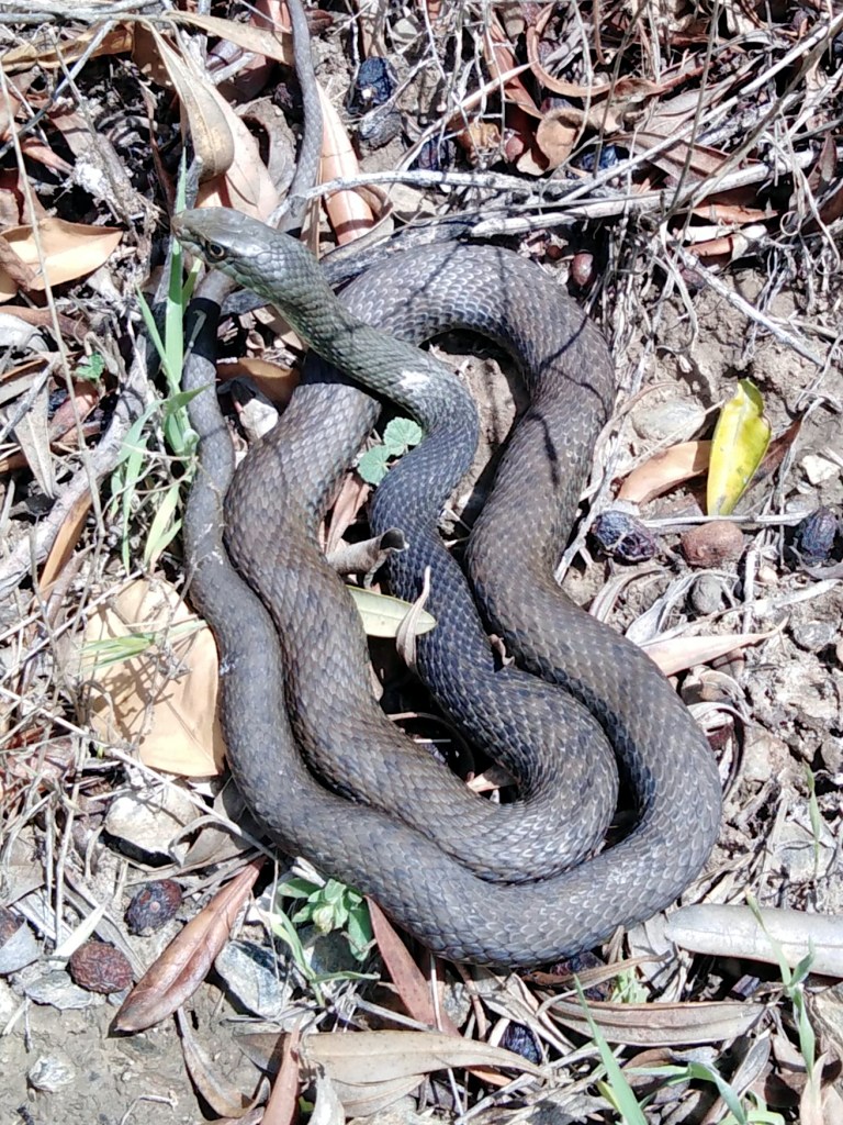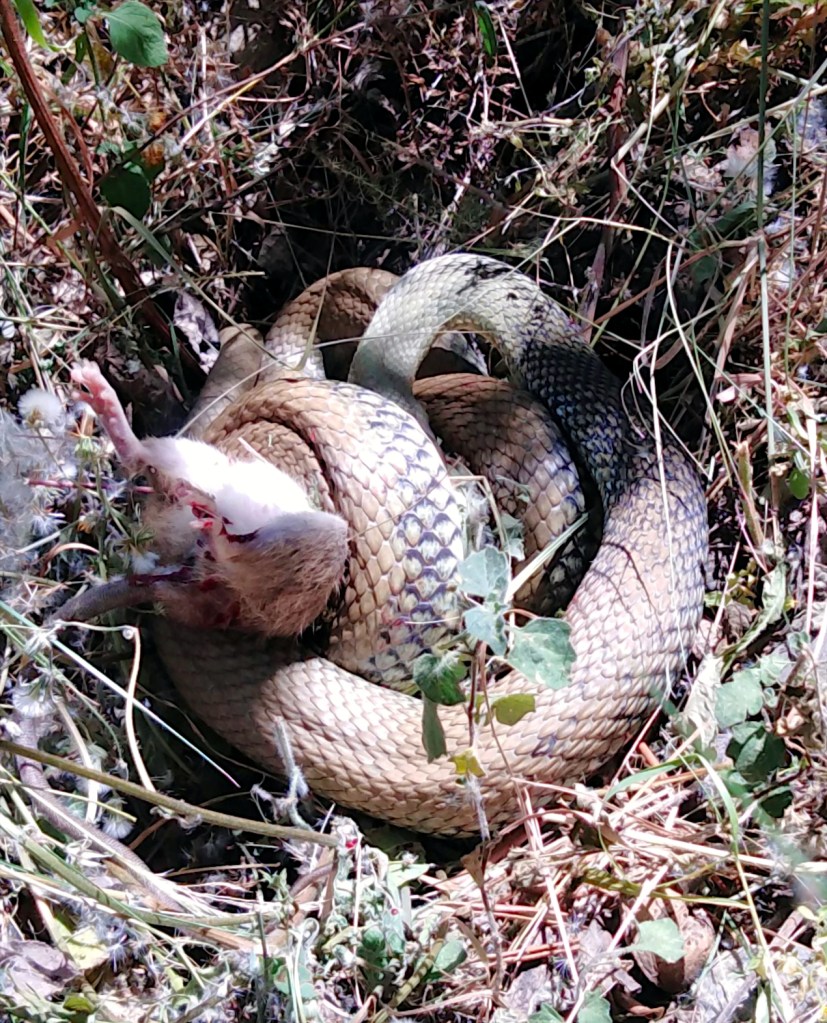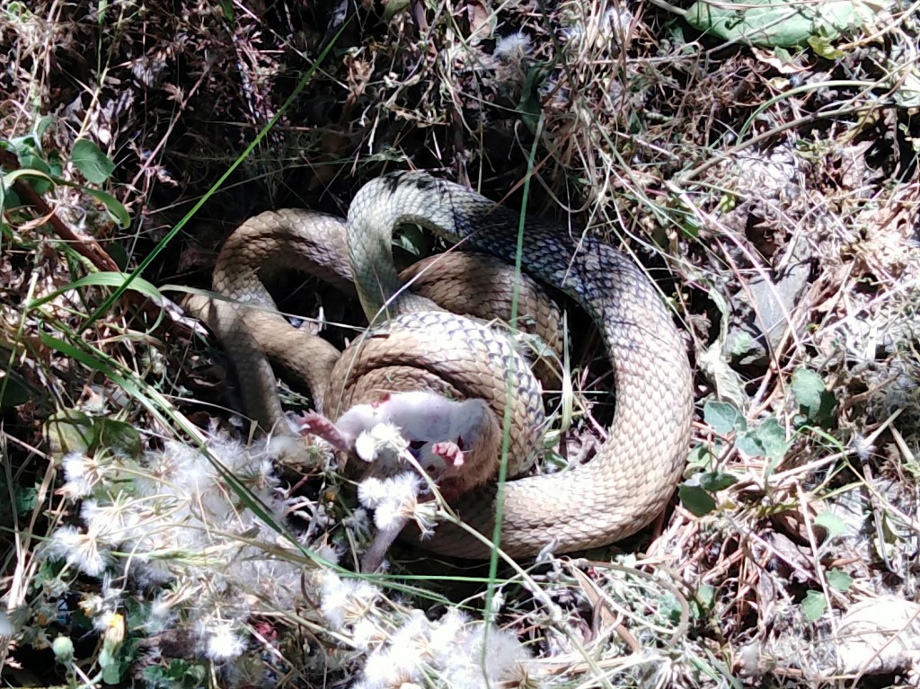 A pesar de mi presencia cercana la serpiente no soltó a su víctima, una rata de buenas dimensiones, hasta haberse asegurado de que estaba muerta. Entonces, de un salto se encaramó a un balate de piedras de más de dos metros, más o menos la longitud del ejemplar, para esconderse entre la vegetación. En un primer momento abandonó a su víctima en el lugar, que sin embargo había desaparecido al cabo del rato.