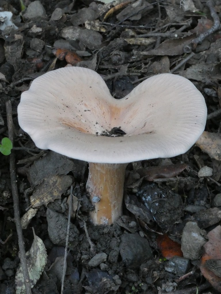 Todo el cuerpo fructífero presenta una coloración entre ocre y beig bastante uniforme, si bien las láminas tienen un tono ligeramente más claro. Éstas descienden decurrentemente hacia el pie, el cual se ensancha hacia el extremo inferior y carece de anillo. Es fibroso por lo que suele desecharse a la hora de ser cocinado.